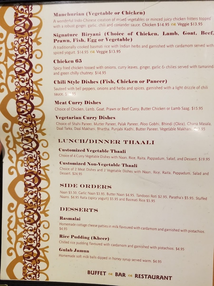 Welcome to New India Buffet Bar & Restaurant, where every meal is a vibrant adventure through the rich culinary heritage of India! Located at 901 W Broadway in Vancouver, our menu offers a delightful array of specialties designed to tantalize your taste buds. Dive into our tantalizing Indian buffet, featuring mouthwatering dishes like Lentils Palak Paneer, hearty Egg Plant Curry, and classic Lamb Curry that will leave you craving more. Don't miss our delectable Lamb Biryani, paired perfectly with a refreshing Mango Lassi. For a lighter option, our Customized Vegetable Thaali will satisfy both vegetarians and those looking to explore fresh flavors. And to round out your experience, sip on our authentic Chai Tea or enjoy a refreshing glass of Ice Tea or Lemonade. Whether it’s a quick lunch or a leisurely dinner, our inviting atmosphere and exquisite offerings promise a culinary experience like no other. Come taste the magic of India at New India Buffet Bar & Restaurant!